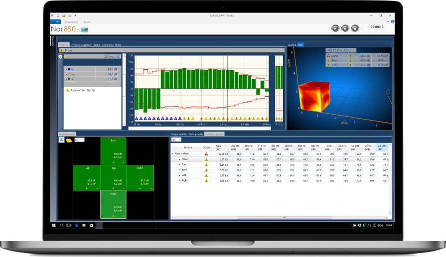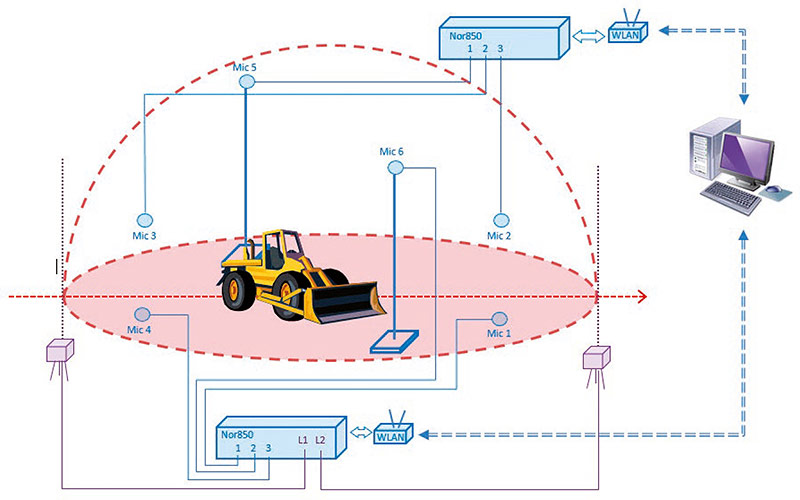 Die Messungen an den einzelnen Messpositionen könnten entweder sequentiell per Schallpegelmesser gemacht und anschließend in der Software Nor850 ausgewertet werden. Alternativ erfolgt die Steuerung und Auswertung der Schallpegelmessung direkt mehrkanalig über die Software Nor850. Als Messkanäle werden die Schallpegelmesser Nor145, Nor150, Nor140 und/oder das Multikanal-Rack Nor850-MF1 an den Laptop angeschlossen. Es lassen sich mehrere Multikanal-Racks und Schallpegelmesser kombinieren, die jeweils über LAN, WLAN oder USB mit dem PC verbunden sein können.
