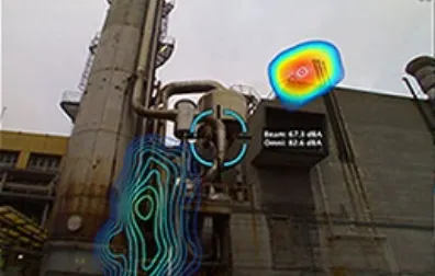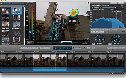 Hier haben wir die akustische Kamera spontan mal vor einem Transformator aufgestellt. Das dominierende Geräusch ist der Transformator. Das ist das einzige Geräusch, welches der Bediener selber wahrnimmt. Auf der X-Achse wird dann der Frequenzbereich geändert, so dass hochfrequente Schallquellen auftauchen. Dann wird das virtuelle Mikrofon auf diese Schallquelle gerichtet. Das Knistern an den Isolatoren ist deutlich zu erkennen.