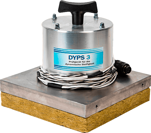 Die dynamische Steifigkeit kennzeichnet das Federungsvermögen einer Dämmschicht einschliesslich der in ihr eingeschlossenen Luft. Das System DYPS 3 arbeitet mit der in der DIN EN 29052-1 als Referenzmethode definierten, sinusförmigen Anregung des Prüfgutes. Eine Materialprobe von 200 x 200 mm wird auf einer ebenen Grundplatte angeordnet. Auf die Materialprobe kommt eine Stahlplatte, die mit allen Messsensoren 8 kg wiegen muss. Diese Anordnung wird mit einem Schwingerreger angeregt, wobei die eingebrachte Kraft zwischen 0,1 und 0,8 N konstant sein muss. Die Anregung erfolgt mit einem Sinussignal mit veränderbarer Anregungsfrequenz. Mittels eines Beschleunigungsaufnehmers wird die Resonanzfrequenz bei der kleinstmöglichen Anregekraft bestimmt. Die Messsoftware steuert das gesamte System, regelt die Einspeisekraft und misst die Resonanzfrequenz. Mit Hilfe des Reportgenerators können die erforderlichen Protokolle konfiguriert und kundenspezifisch Berichte erstellt werden.