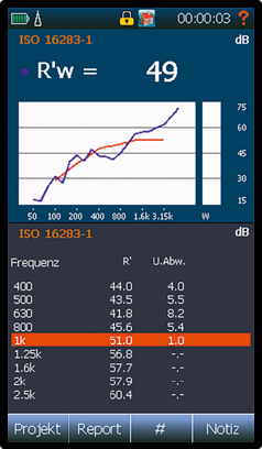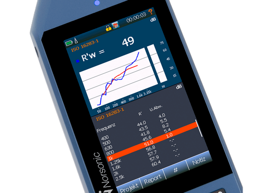 Die komplette Projektverwaltung und -Auswertung einer Schalldämmungsmessung nach DIN EN ISO 16283-1/-2/-3 und nationalen Sonderregelungen (wie u.a. DIN 4109) steht im Schallpegelmesser zur Verfügung. Die Messung, Mittelwertbildung und Auswertung - bis hin zur Berechnung der Einzahlangabe wie dem Bau-Schalldämm-Maß R’w - kann also am Handgerät erfolgen. Dazu ist kein externes Bedienelement erforderlich. Über die kostenfreie Übertragungs- und Berichtssoftware NorConnect kann mit einem Mausklick der Messbericht erstellt werden. Alternativ können die Daten über WLAN oder das interne 4G-Modem direkt in die NorCloud hochgeladen werden.