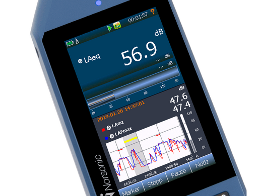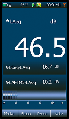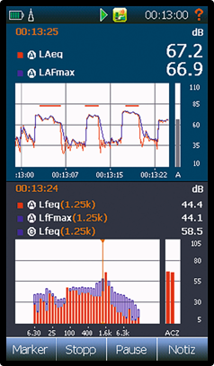 Die Erfassung der Pegelzeitverläufe ist mit einer Auflösung ab 5 ms möglich. Es können auch Pegelzeitverläufe mit verschiedenen zeitlichen Auflösungen parallel gespeichert werden - z.B. mit 125 ms und 1 min - und das jeweils für Breitbandparameter wie LAeq / LAFmax und Frequenzbänder. Über die Pause-Funktion lassen sich Störgeräusche direkt aus der Messung löschen, sogar mit flexibler Rückwärtslöschung. Somit wird die Notwendigkeit der Nachbearbeitung im besten Fall ganz eliminiert oder der Zeitaufwand zumindest deutlich reduziert. Tonaufzeichnungen, Sprach- und Textnotizen, Fotos, sowie bis zu 10 frei definierbare Marker (pro Benutzer-App) ermöglichen eine aussagekräftige Dokumentation der Messung.