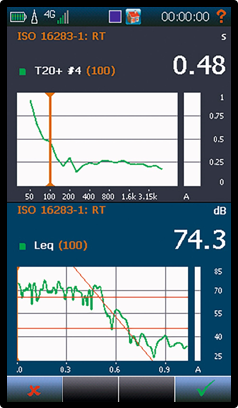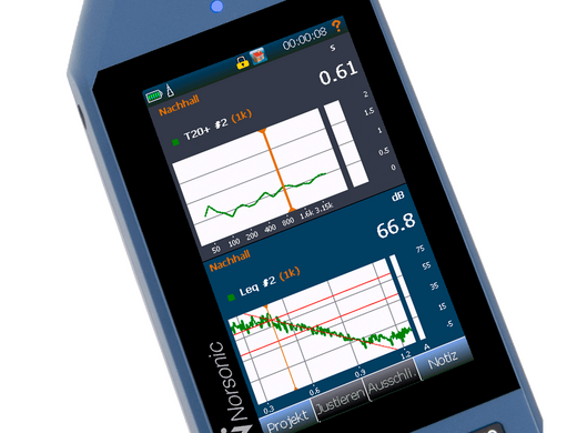 Der Schallpegelmesser Nor145 ist auch das ideale Messgerät für die Klassifizierung der Raumakustik. Wahlweise in Terzen oder Oktaven werden die Größen Nachhallzeit (T60) und Early Decay Time (EDT) gemessen. Der Nor145 unterstützt die Messung der Nachhallzeit über alle drei möglichen Methoden: Impuls, Rauschen, SweptSine (in Kombination mit der Software Nor850). Die Mittelwertbildung und auch Anpassung der Regressionsgeraden kann direkt im Gerät vorgenommen werden. Parallel zur Nachhallzeitmessung kann auch eine Tonaufzeichnung erfolgen - zwecks nachträglicher Auralisation oder weiterer Analysen.