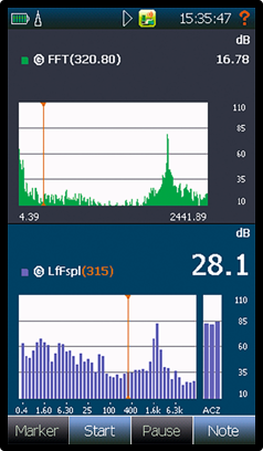 Frequenzanalysen können sowohl als Oktav-/Terz-, als auch als Schmalband FFT-Analysen durchgeführt werden – und das sogar parallel. Die Frequenzspektren werden im normalen Pegelmessmodus, also auch parallel zu allen Breitbandparametern erfasst. Es ist somit keine separate Messung nötig. FFT-Analysen eignen sich z.B. für die Maschinendiagnose bzw. das Auffinden tonaler Komponenten in einem Geräuschsignal. Das Signal kann mit einer konstanten Frequenzauflösung von 1,46 Hz (15016 Linien) oder alternativ 2,93 Hz (7508 Linien) von 0 bis 22 kHz analysiert werden. Die Signalstärke kann logarithmisch [dB] oder linear [Engineering Units, EU) angezeigt werden (z.B. bei Verwendung eines Beschleunigungsaufnehmers). Die Messdaten lassen sich einfach zum PC übertragen (via WLAN / LAN / USB / SD-Karte) und stehen direkt in offenem Textformat zur Verfügung oder können komfortabel in der Norsonic-Software ausgewertet werden.