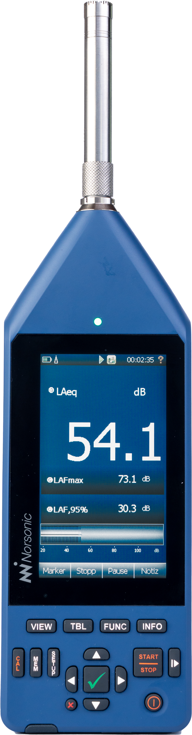 Im Schallpegelmodus werden sämtliche Pegelgrößen – sei es für ganz allgemeine Schallpegelmessungen, im Bereich Arbeitsschutz (LärmVibrationsArbSchV), Schallimmissionsschutz (TA Lärm / DIN 45680) oder Schallleistung (z.B. ISO 3744) – gleichzeitig erfasst, und das in einem einzigen Messbereich. Laden Sie einfach die App, kalibrieren und starten die Messung. Die zwei Messkanäle des Nor150 ermöglichen die synchrone Messung mit entweder zwei Mikrofonen, zwei Beschleunigungsaufnehmern oder einem Mikrofon und einem Beschleunigungsaufnehmer (Quellensuche – Korrelation zwischen Luft- und Körperschall). Mit einer Abtastrate von 96 kHz und einem Frequenzbereich von 0,4 - 40 kHz wird auch die Messung von Infra- und Ultraschall unterstützt.