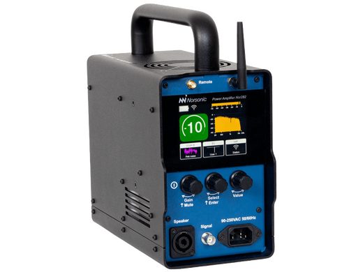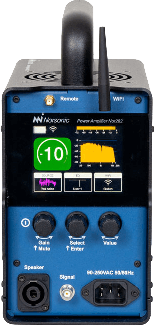 Der Leistungsverstärker Nor282 ist extrem kompakt, robust und leicht. Da die Kapazität des Akkus in der Praxis für bis zu 3 Messtage ausreicht, gehört das Tragen einer Kabeltrommel der Vergangenheit an. Der interne Signalgenerator wird über WLAN direkt vom Schallpegelmesser Nor145 oder von der Software Nor850 gesteuert. Effizienter geht es nicht mehr, sehen Sie hier im Video: