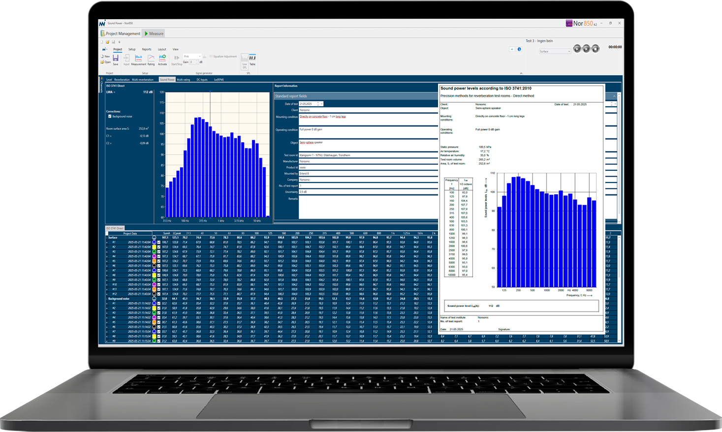 Die Messungen an den einzelnen Messpositionen könnten entweder sequentiell per Schallpegelmesser gemacht und anschließend in der Software Nor850 ausgewertet werden. Alternativ erfolgt die Steuerung und Auswertung der Schallpegelmessung direkt mehrkanalig über die Software Nor850. Als Messkanäle werden die Schallpegelmesser Nor145, Nor150, Nor140 und/oder das Multikanal-Rack Nor850-MF1 an den Laptop angeschlossen. Es lassen sich mehrere Multikanal-Racks und Schallpegelmesser kombinieren, die jeweils über LAN, WLAN oder USB mit dem PC verbunden sein können.
