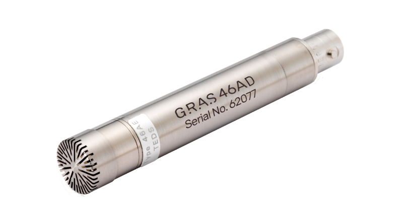 Mikrofonset bestehend aus vorpolarisiertem 1/2"-Druckmikrofon 40AD und 1/2" CCP-Vorverstärker 26CA mit integriertem TEDS-Chip und BNC-Stecker.