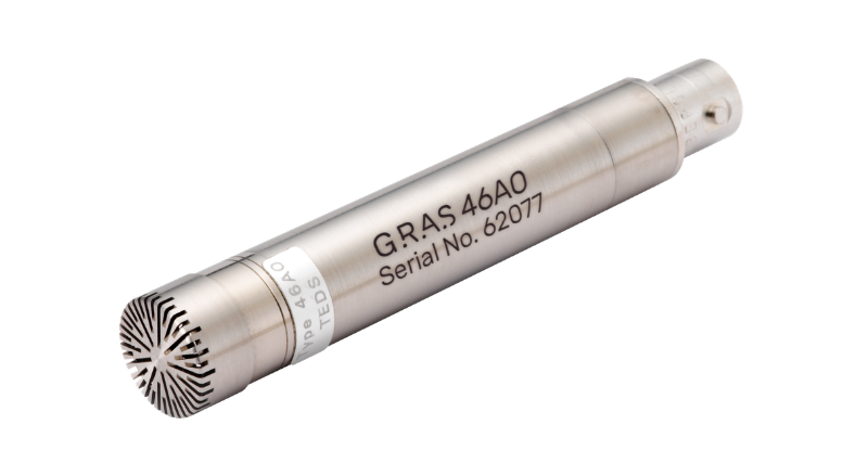 Mikrofonset bestehend aus vorpolarisiertem 1/2"-Druckmikrofon 40AO und 1/2" CCP-Vorverstärker 26CA mit integriertem TEDS-Chip und BNC-Stecker.