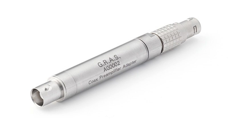 AG0002 ist ein Adapter zur Verbindung eines CCP-Vorverstärkers mit einem Versorgungsmodul mit LEMO-Eiungangsbuchsen. Das eine Ende wird in die LEMO Eingangsbuchse des Versorgungsmoduls gesteckt, die BNC Buchse am anderen Ende wird mit einem CCP-Vorverstärker/Mikrofon-Set verbunden.