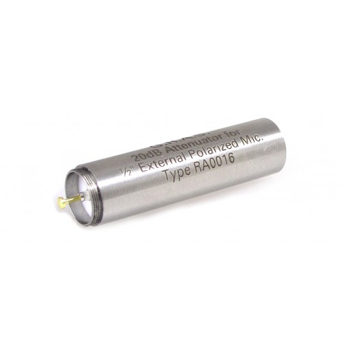 Empfehlung: Wählen Sie besser ein Mikrofon mit einer geringen Empfindlichkeit, anstatt den RA0016 zu verwenden. Der RA0016 ist ein 20 dB-Abschwächer, der zwischen einem 1/2”-Mikrofon und einem Vorverstärker eingefügt wird. Er dämpft das Ausgangssignal des Mikrofons um 20 dB, um eine Übersteuerung des Vorverstärkers oder nachfolgenden Analysators zu vermeiden. Der RA0016 funktioniert nur mit extern polarisierten Mikrofonen einwandfrei. Für vorpolarisierte Mikrofone ist RA0018 zu verwenden.